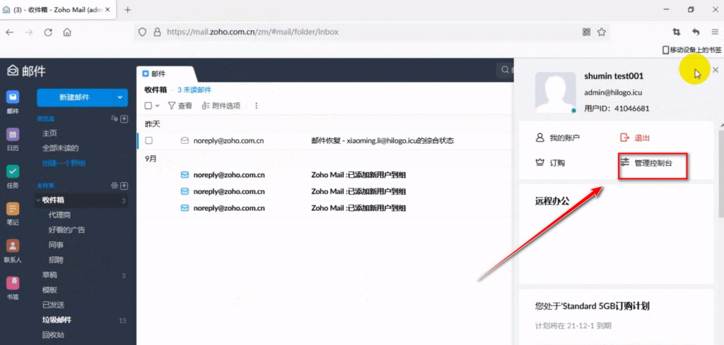 1、使用管理员账号登录Zoho Mail主邮箱