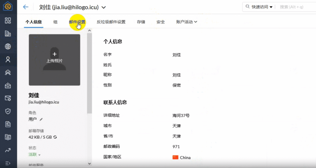 4、在该个人用户的页面,选择“邮件设置”